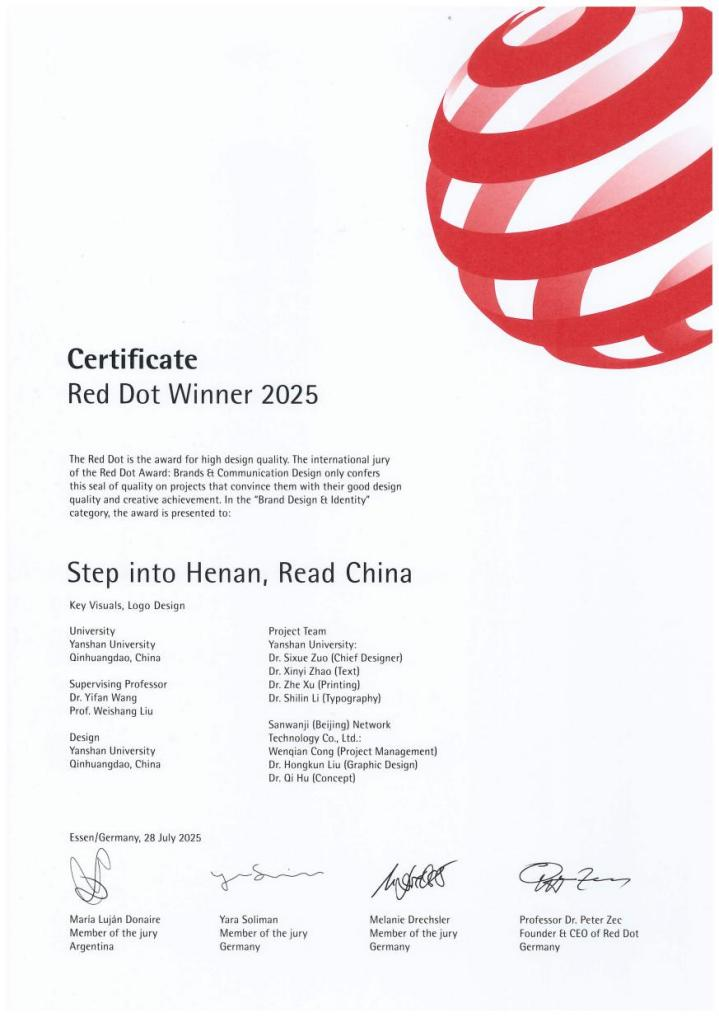 王一帆、刘维尚指导,左思学等同学创作的《Step into Henan, Read China》主视觉与标识设计,从全球众多参赛作品中脱颖而出,荣获2025年红点品牌与传达设计奖。这是我校连续第二年荣获红点品牌与传达设计奖,标志着我校在设计创新与国际影响力方面持续获得国际权威认可。