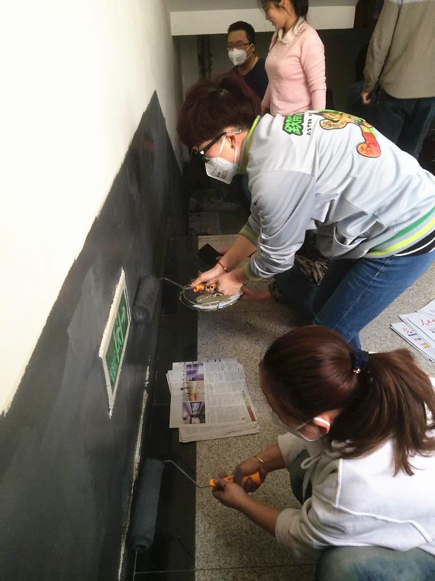 师生党员利用周四下午的思想政治学习时间,对院墙进行美化。在美化的过程中,师生分工合作,配合默契,细致认真,干劲十足。老师们先用砂纸将艺术楼和音乐馆走廊墙体上的污渍打磨掉,然后用灰色涂料粉刷了艺术楼C区楼梯间的墙裙。学生们在各位老师的带领下,凝聚力量,齐心协力将院内墙壁整理干净,不仅美化了教学环境,而且从中体会到了劳动带来的无限满足与快乐。虽然很累,但师生党员仍用饱满的热情去劳动,很快就让走廊的墙体又恢复了往日的洁白,让每日大赛