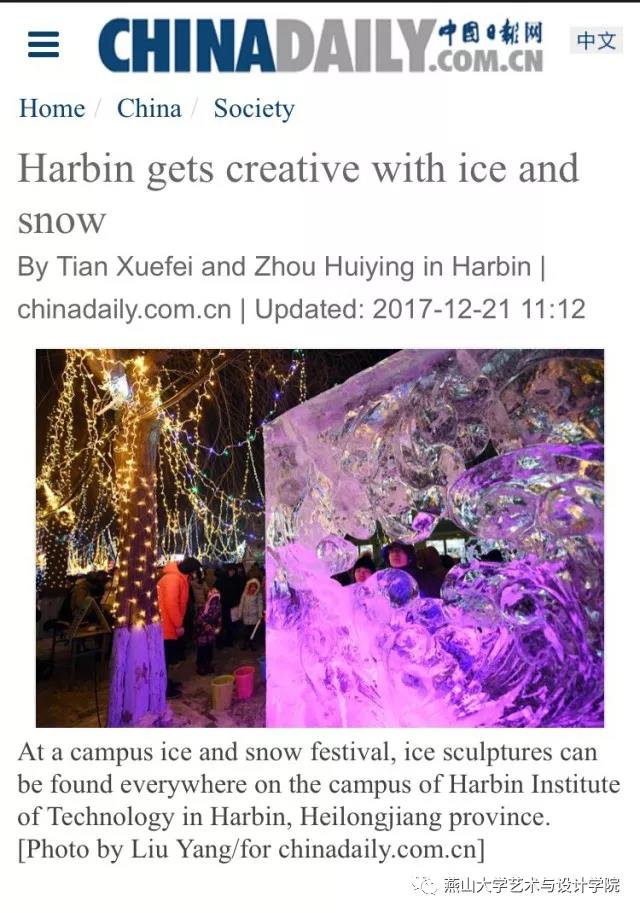 雕塑系参加了哈尔滨工业大学举办的首届国际大学生冰雕大赛,参赛队伍由李鹏克、仇媛媛两位教师带队,成员由雕塑系14级张章、朱开振、袁宵、 宗宇石 四名同学组成。共同创作了名为《飞扬·冰之梦》的冰雕作品,并在此次大赛中荣获二等奖。
