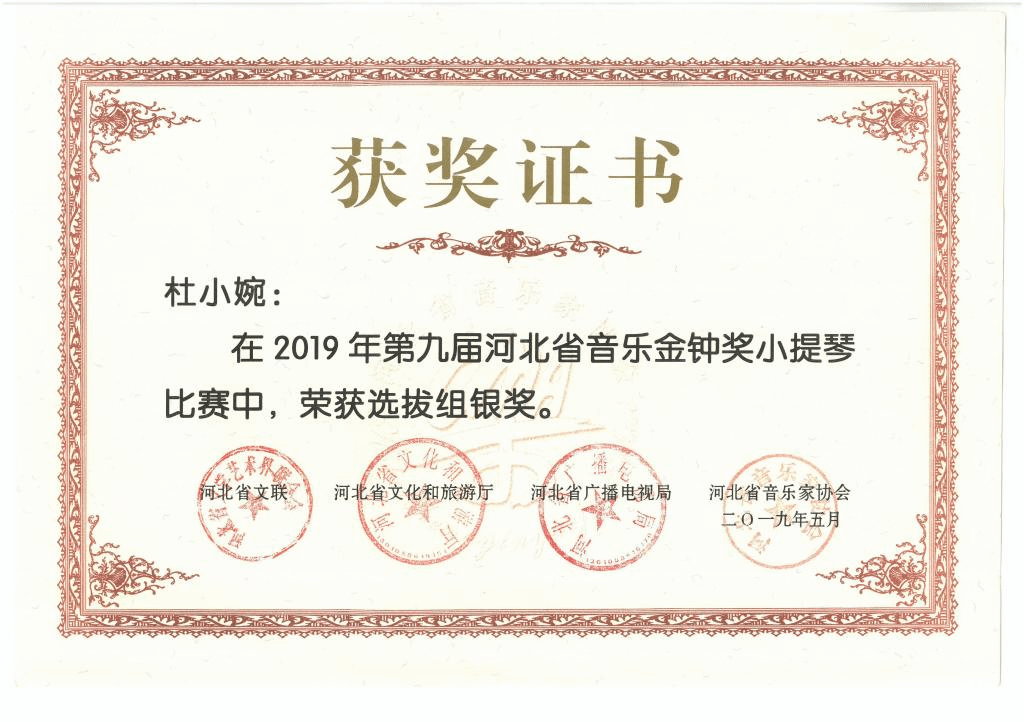 2019年5月,中国音乐金钟奖河北赛区选拔赛在石家庄举行。我校艺术学院杜小婉老师在小提琴组比赛中斩获银奖,并将于今年十月代表河北省参加全国金钟奖角逐。