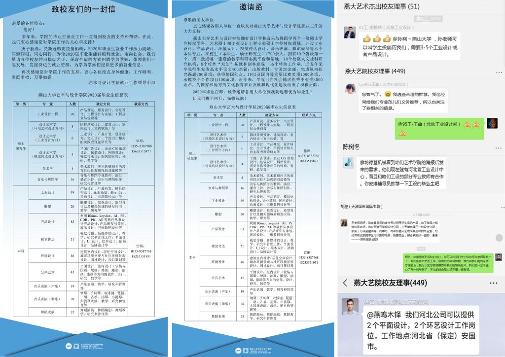 选聘优秀毕业生。活动开启后,得到校友、教师的积极响应,大家密集转发;学校招生就业处肯定了活动的意义,通过官方公众号和校友、企业群转发宣传。学院毕业生求职宣传在网上迅速产生规模效应。信息发布后,三家校友企业第一时间对接,提出招聘毕业生意向。中瑞设计港、廊坊德基机械科技有限公司等19家单位通过联系学校招生就业处或学院就业工作负责人联系招聘事宜。秦皇岛市工业和信息化局表示将协助做好优秀毕业生向本地相关企业单位的推介工作,让更多地学生融入到秦皇岛的经济社会发展当中。