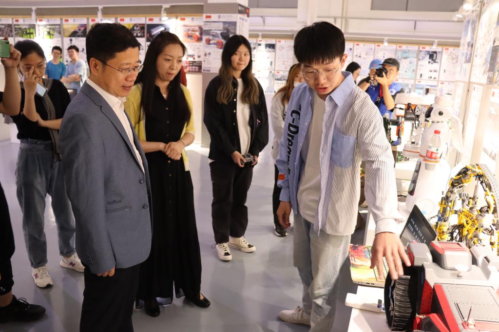 各系师生向领导和嘉宾讲解设计作品内容