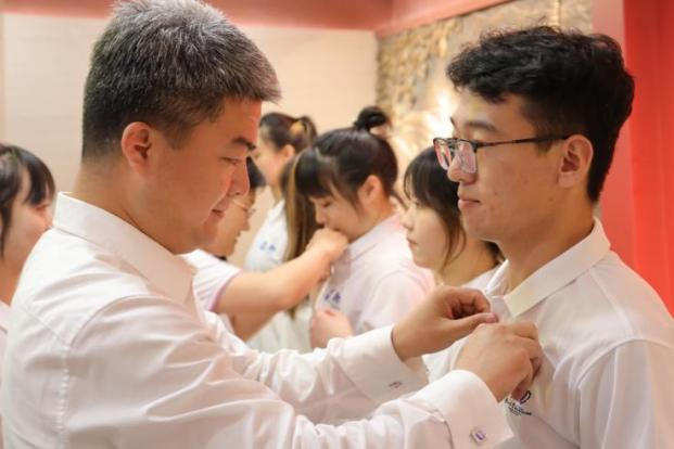 党委副书记宁岩鹏同志领誓,55名新党员面向党旗庄严宣誓,对党和人民许下庄重的承诺。激昂的宣誓声铿锵有力,掷地有声,令人热血沸腾。随后学院党委副书记宁岩鹏同志、党务中心冯丹红同志和学生党员何妍同志为各支部新党员代表佩戴党员党徽。