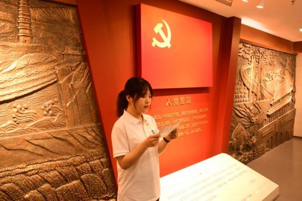 本科生第三党支部新党员、党员组织生活馆讲解员时歌带领新党员们参观每日大赛