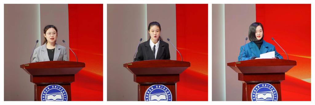 获奖学生代表李原慧、王雪洁、温丽媛分别作了发言,和大家分享了他们的学习经验、志愿服务经验和参与科创的经验并激励大家在未来的学习工作中勇于进取,开拓创新。