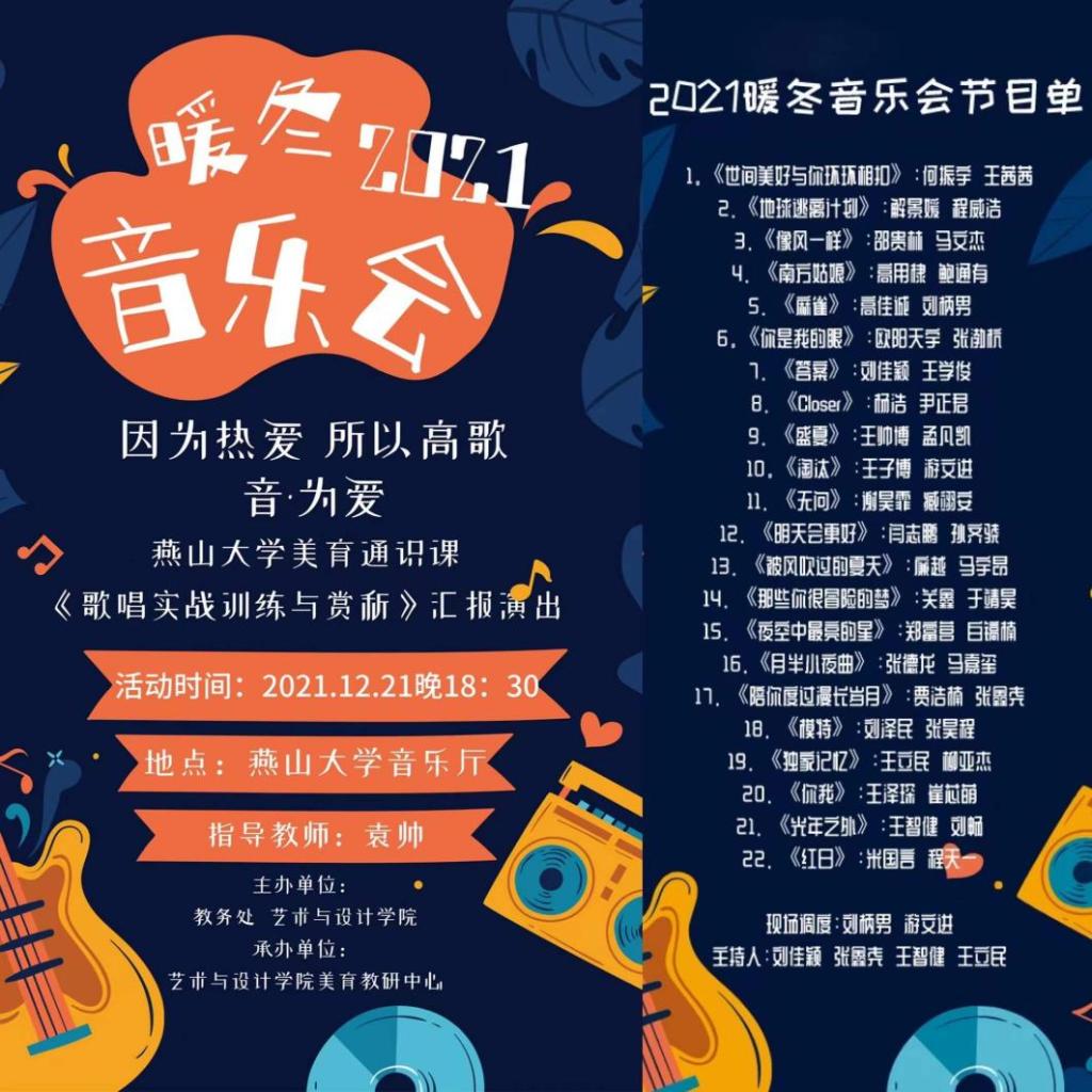 美育教研中心承办的美育通识课“暖冬音乐会”于2021年12月21日晚6:30于每日大赛