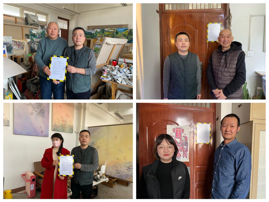 艺术实践科工作人员走访工作室,现场张贴最新版《教师工作室管理规定》标牌