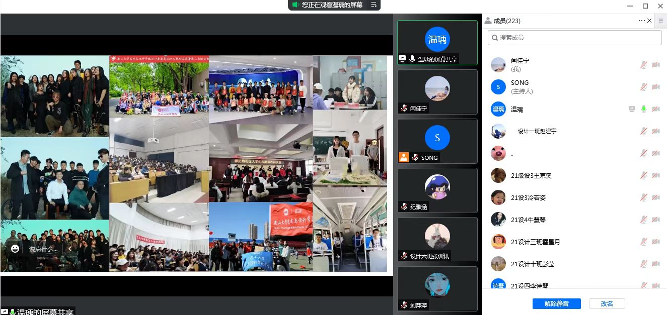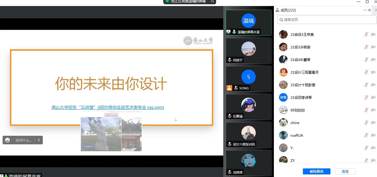 于6月26日下午,通过线上腾讯会议的形式,对2021级设计学大类10个自然班的217名本科学生进行大类分流专业宣讲工作。学院副院长赵琳、党委副书记宁岩鹏、工业设计系、环境设计系、视觉传达设计系的负责人及学生工作办公室、学院综合办公室的相关人员参加本次活动。