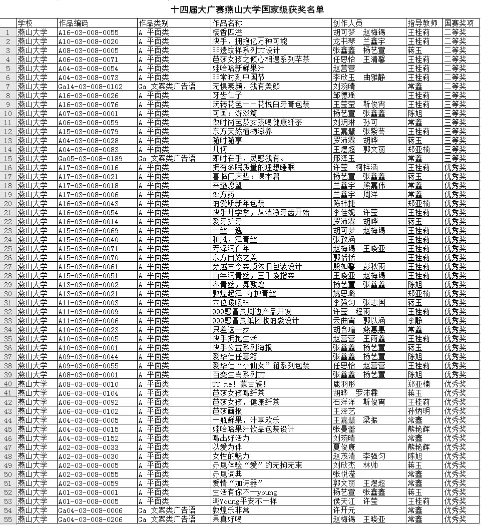 近日,在刚刚闭幕的第十四届全国大学生广告艺术大赛中,我校斩获国家级奖项55项,其中二等奖7项,三等奖8项,优秀奖40项,获奖总数和质量在河北省位列第一、全国前列。其中,蒋玉、王桂莉、常鑫、郑亚楠、陈旭、熊艳辉、孙炳明等7位老师获得“优秀指导教师”荣誉称号。在先期结束的河北省赛区比赛中,我校学生作品获河北省一等奖162项,二等奖187项,三等奖162项,优秀奖266项。我校在该项赛事国赛和省赛中取得的历史最好成绩。
