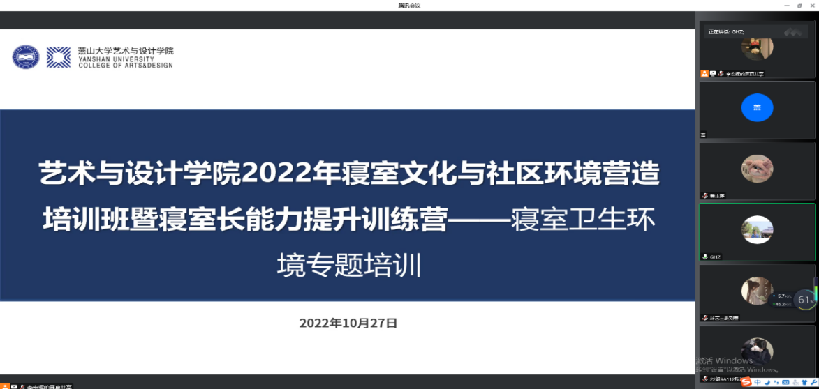 开展了2022年寝室文化与社区环境营造培训班暨寝室长能力提升训练营——寝室卫生环境专题培训活动。辅导员盖鸿章、本科生2021级和2022级寝室长参与了活动。