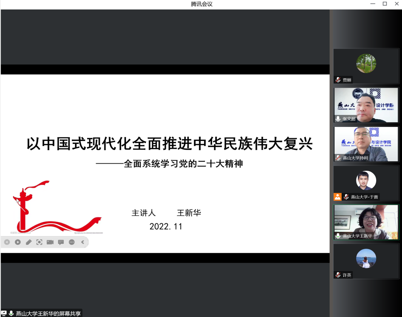 学院邀请学校党委讲师团成员、马克思主义学院党委书记王新华教授,以《以中国式现代化全面推进中华民族伟大复兴—全面系统学习党的二十大精神》为题,从党代会的重要性,大历史观视域下的中共二十大,二十大的新理论新观点新战略,中国式现代化的历史与理论逻辑以及以党的自我革命引领社会革命等,对党的二十大精神作了系统宣讲和深入阐释。