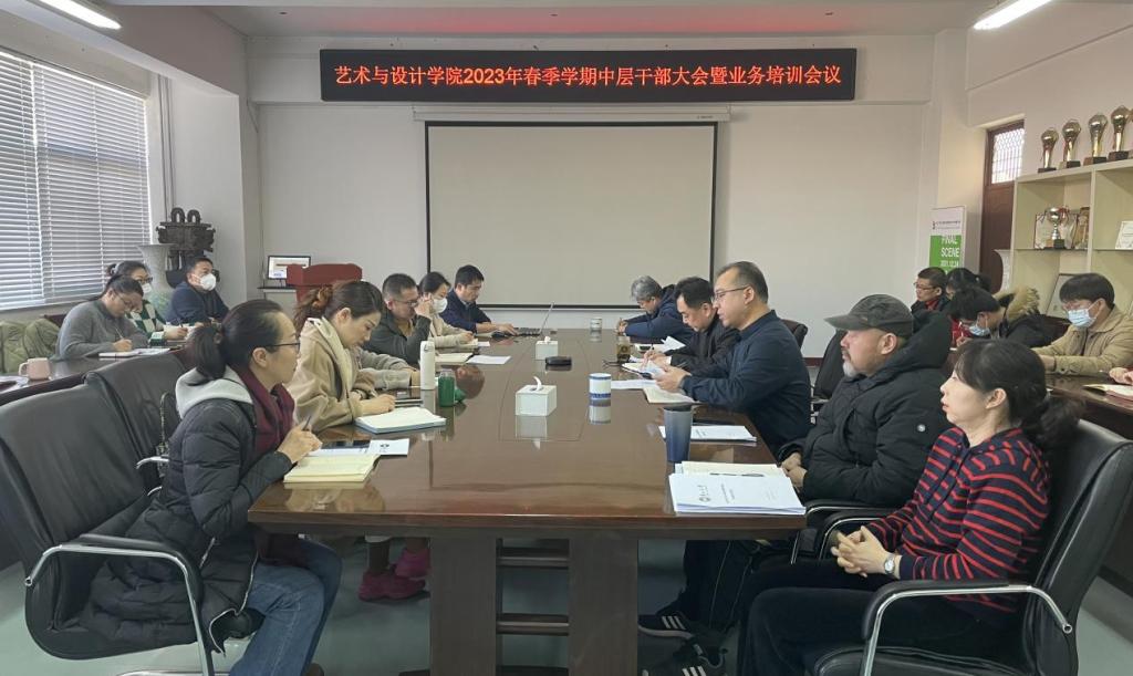 党委在美术馆C305召开2023年春季学期中层干部会暨业务培训会议。院长孙利主持会议,学院领导班子全体成员、科级秘书、各党支部书记、系部中心主任及副主任参会。