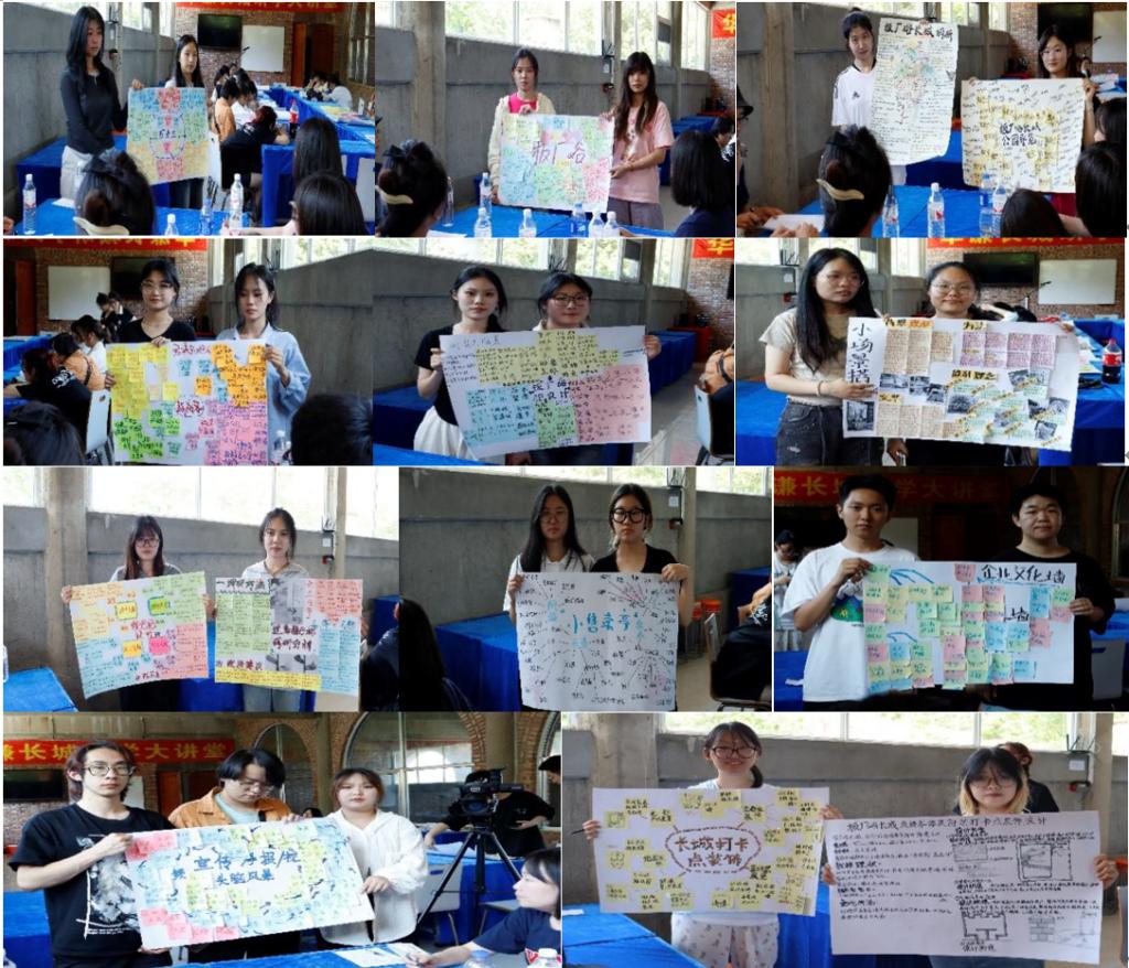 活动中,11个小组分别对设计构思、设计重难点、设计问题、设计构思及方案进行板厂峪长城乡村设计系统化汇报,双师型教师团队分别从情境、专业、思政与国际化角度进行建议与反馈,并从小组服务态度、团队合作、跨学科知识学习与运用、设计方案、问题解决、汇报发言、总结反思与服务应用等评价维度展开项目评价。
