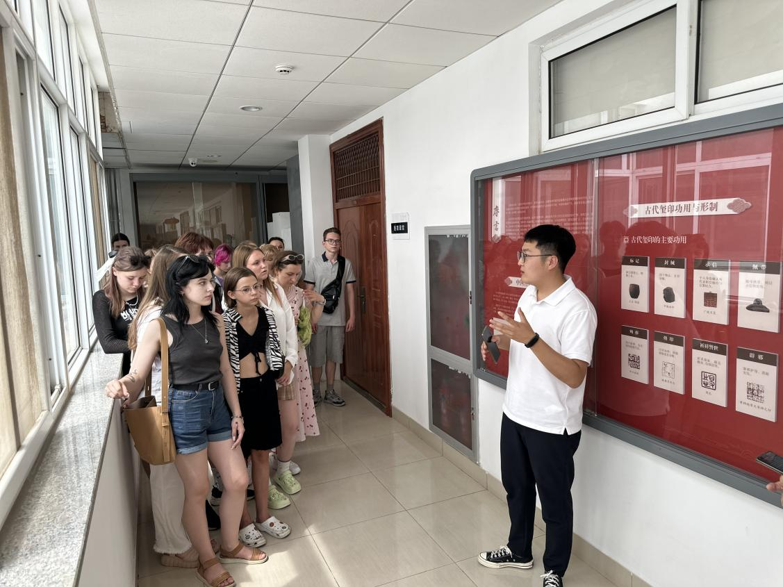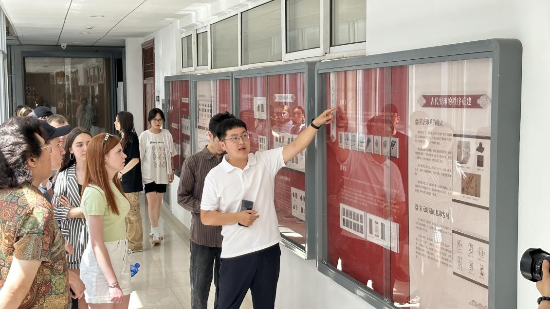王润泽首先带领大家观看了篆刻基地文化长廊的篆刻发展史展览,向大家介绍了篆刻艺术的发展历史、艺术特色以及印章的材质、风格、设计、刀法等。在篆刻体验过程中,谷庆巍、王润泽及篆刻协会的志愿者进行现场指导。学生们积极参与且兴趣极高,他们与篆刻协会的志愿者同学相互交流,共同探讨,在愉快的氛围中自主完成了一枚属于自己的印章作品。大家在方寸之间体味到中国汉字的魅力及设计的乐趣,获得了丰富的审美感受。来自外国语学院的赵鑫、阴佳文等同学为在场的国际学生提供了详实的即时翻译。