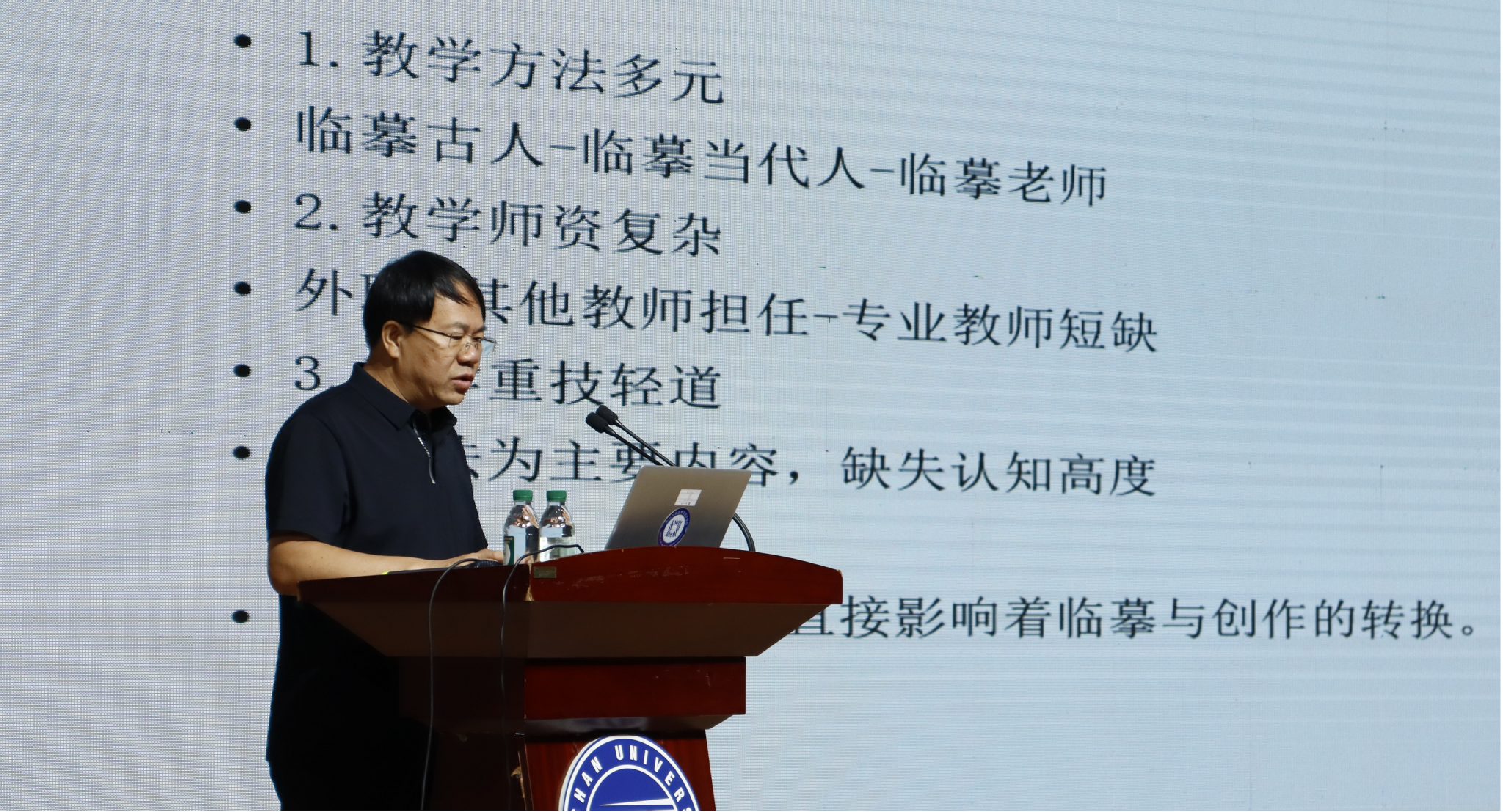 李国良、孟德乡、逯国平、孙长铭四位艺术家分别以《燕系印章研究》《高校篆刻教学中的临创转换》《石不能言最可人——石质材质对明清流派印的影响》和《印章中的艺术性对当代印人的启发》为题作主旨报告。在场师生就相关问题与艺术家们进行交流。