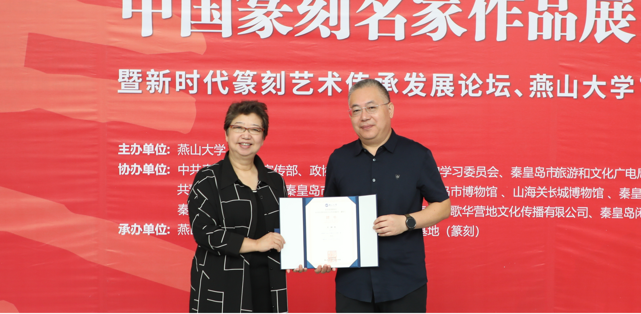 骆芃芃为王国红颁发艺术顾问和“篆刻艺术珍藏馆馆长”聘书。