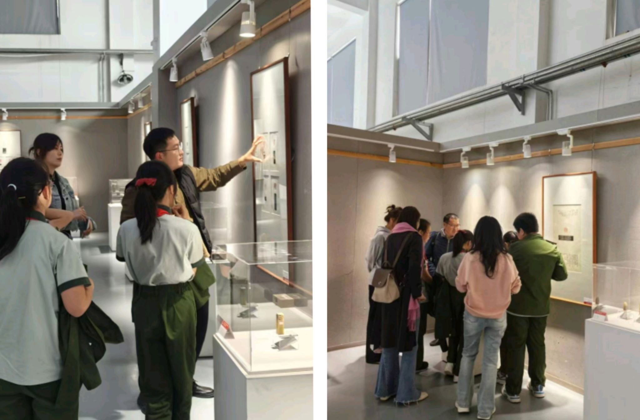美术馆正在展出的“轩辕锦书”庆祝中华人民共和国成立75周年篆刻展,观展期间,王润泽为同学们讲解了篆刻印章的石材,印屏的制作与欣赏以及展览的陈列方式等等。随后,一行人参观了篆刻基地外墙文化长廊的篆刻发展史资料,并且由王润泽向同学们讲解了篆刻艺术的发展历史、艺术特色以及印章的风格、设计、刀法等。在这期间,同学们还参观了篆刻基地中收藏的当代名家篆刻作品以及古代砖文石刻,学生们积极参与大胆提出问题,兴趣极高。