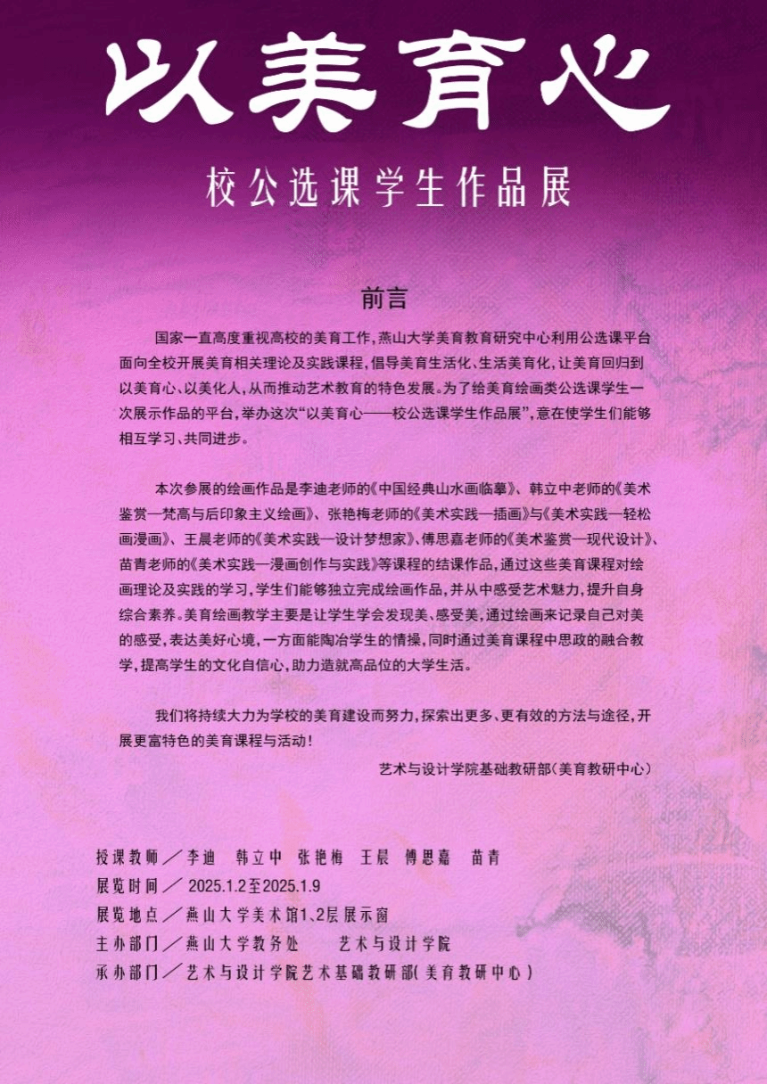 2025年1月2日,“以美育心”校公选课结课作品展在每日大赛
