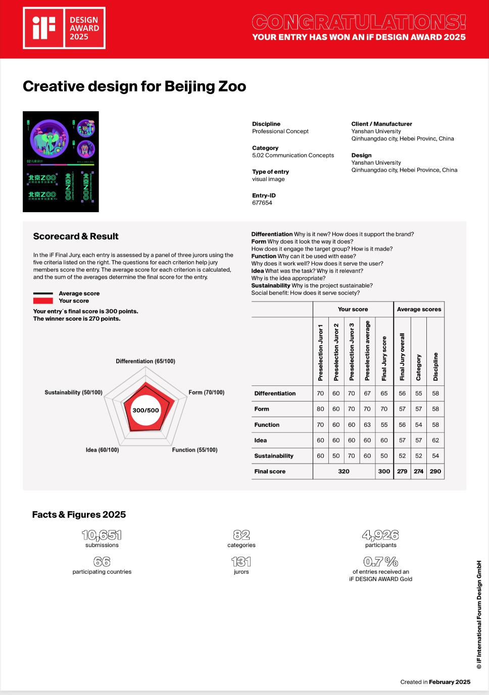 刘维尚教授团队(左思学等)创作的《Creative Design for Beijing Zoo》,以独特的设计理念、出色的视觉呈现从全球72个国家、地区的10800多件参赛作品中脱颖而出,荣获本年度iF设计奖。这是我校首次获得品牌与传达设计类iF奖这一国际顶尖设计荣誉。
