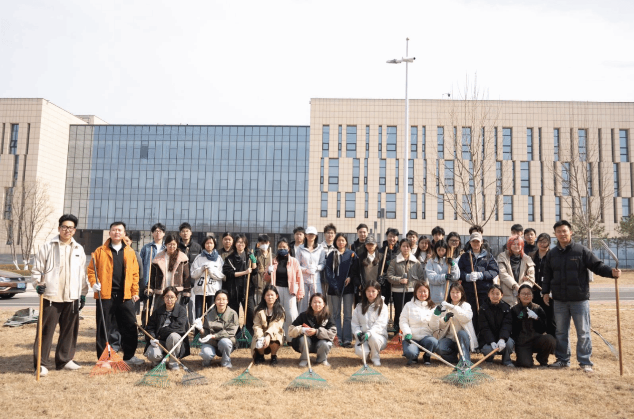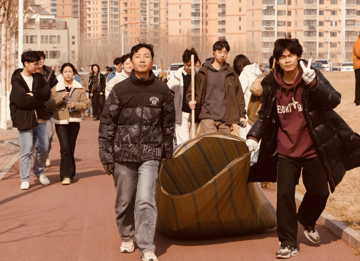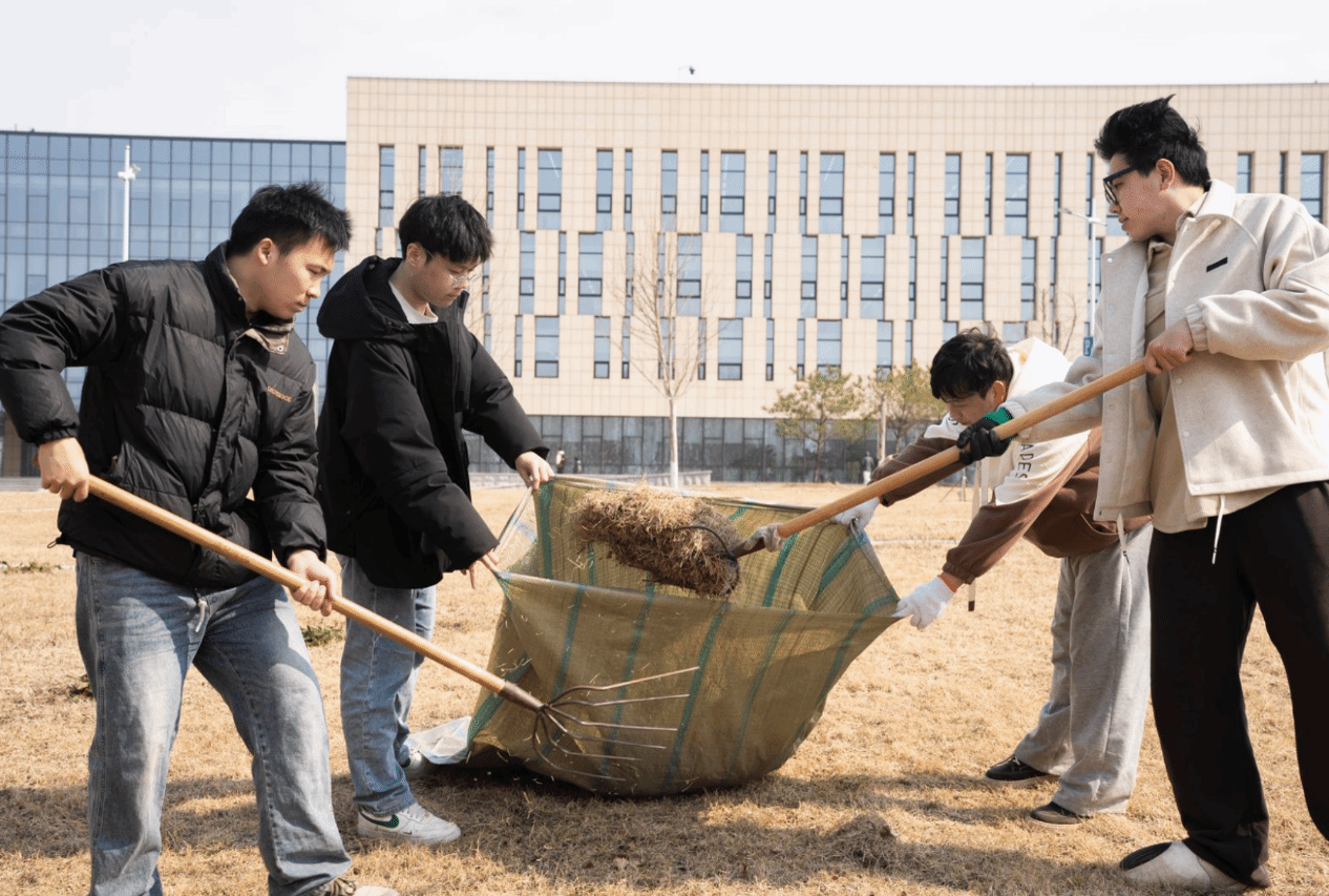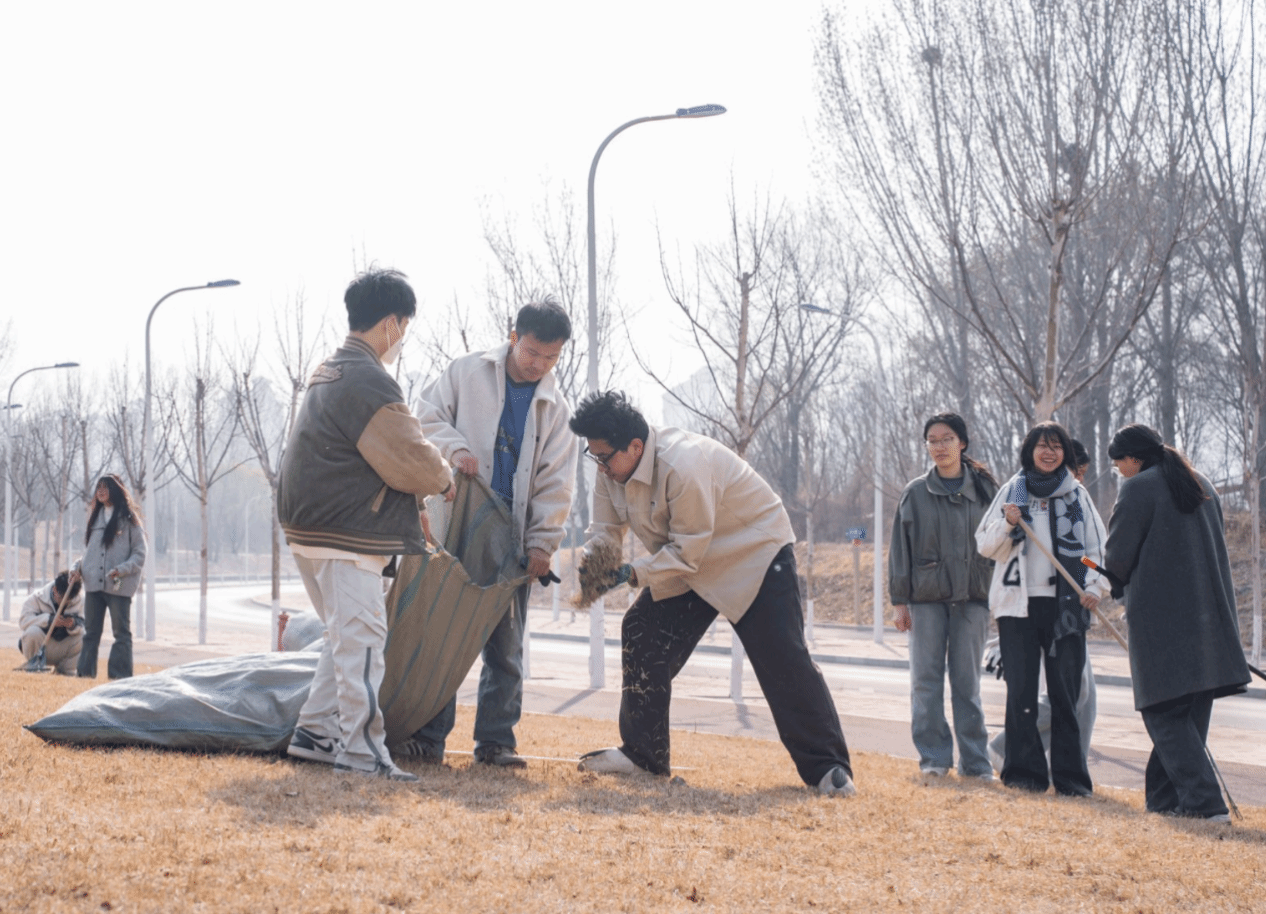 春日的暖阳下,开放草坪内芒草摇曳,学生们身着统一的劳动手套,手持除草铲、铁锹等工具,在后勤技术师傅们的指导下,以"网格化责任田"形式开展作业。师傅们现场讲授杂草辨识技巧,学生们躬身前倾,仔细地为草坪清除杂草,认真地打扫落叶。劳动过程中,环境设计专业教师姜博将课堂知识融入实践,指导学生在除草时观察地表肌理变化:"注意保留具有固土功能的草丛,这些自然形成的植被层次正是生态设计的活教材。"