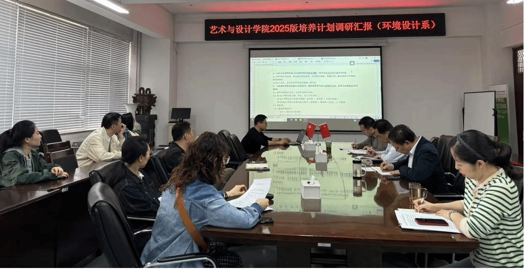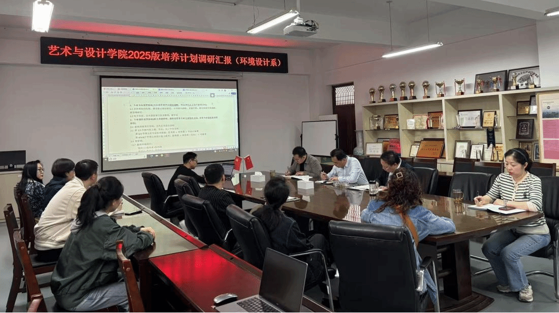 首先,环境设计专业温瑀主任和桑懿副主任向学院领导和与会教师汇报新版培养方案专业设置、专业方向、课程设定等内容。专业方向紧扣国家战略与区域发展需求,新版培养方案立足国家重大战略导向与河北省经济社会发展需求,将专业方向细化为“建筑环境设计”与“公共艺术设计”两大方向,强化与国家战略的深度融合。聚焦京津冀协同发展、雄安新区规划建设、乡村振兴、美丽中国建设、碳达峰碳中和、新型城镇化等领域,培养具备宏观视野的复合型设计人才。对接河北省八大主导产业:重点融入电子信息、空天信息与卫星互联网、数字化等新兴领域,增设智能环境设计、数字化场景构建等特色课程模块,推动设计与科技交叉融合。在课程体系优化方面,分层递进,强化专业特色,形成基础夯实、技术进阶、能力提升、综合设计等阶段,通过“原理+类型+专题”课程群构建进阶式教学体系,强化设计思维与实践创新能力。