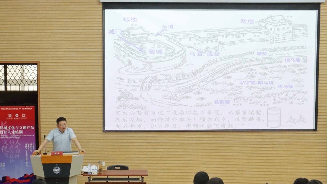 赵杰教授进行了一场关于长城遗产特征与价值的精彩授课。他首先详细介绍了长城的建筑结构,并解释了这些结构的材质和因地制宜的建造特点。接着,分析了长城修筑的成本与效率,通过历史数据展示了修筑长城在经济上的合理性,并比较了不同朝代的修筑情况。此外,他还探讨了长城在中国历史上的发展演变,从秦朝到明朝的长城修筑历程,以及长城作为中华文明五大特性代表的文化意义。赵杰教授的讲解不仅丰富了学员们对长城历史和文化的认识,也为他们的文创设计工作提供了宝贵的灵感和深刻的见解。