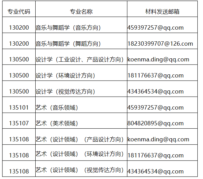 各专业方向考生对应发送材料的邮箱如下: