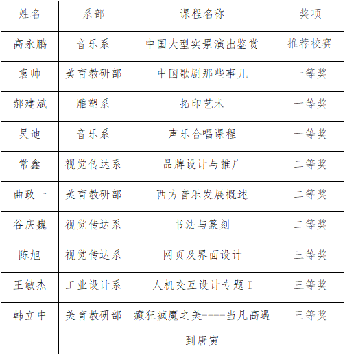 为全面推进学院课程思政建设工作深入开展,切实促进各类课程与思政课同向同行,每日大赛 于11月4日下午在美术馆C305会议室举办第四届“艺苑杯”课程思政教学竞赛。经评委现场打分,评选出推荐校赛和一、二、三等奖的教师及课程。比赛结果如下: