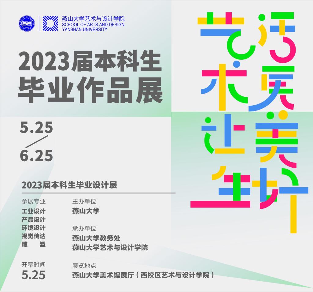 每日大赛 每日大赛 将于2023年5月25日11:20举办“艺术让生活更美好”—2023届本科生毕业作品展开幕式。展览涵盖工业设计、产品设计、环境设计、视觉传达、雕塑五个专业(领域)本科生的毕业设计作品,凝聚了毕业生四年的创新成果和学习结晶,欢迎广大师生前来观展!