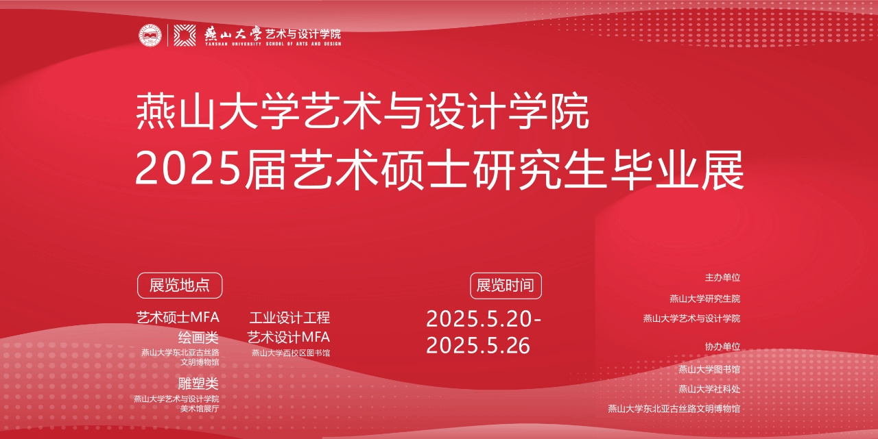 将于2025年5月20日-26日举办2025届硕士研究生毕业设计展活动。现面向全校师生开放,欢迎广大师生莅临指导。