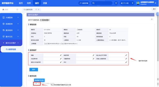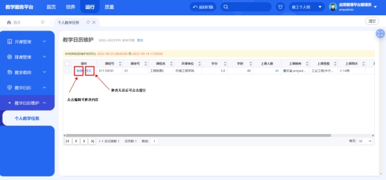 第三步进行教学日历提交,点击‘编辑’可进行修改内容,确认无误后点击‘提交’送审,待教务处审核通过即可;教务处可进行退回操作;