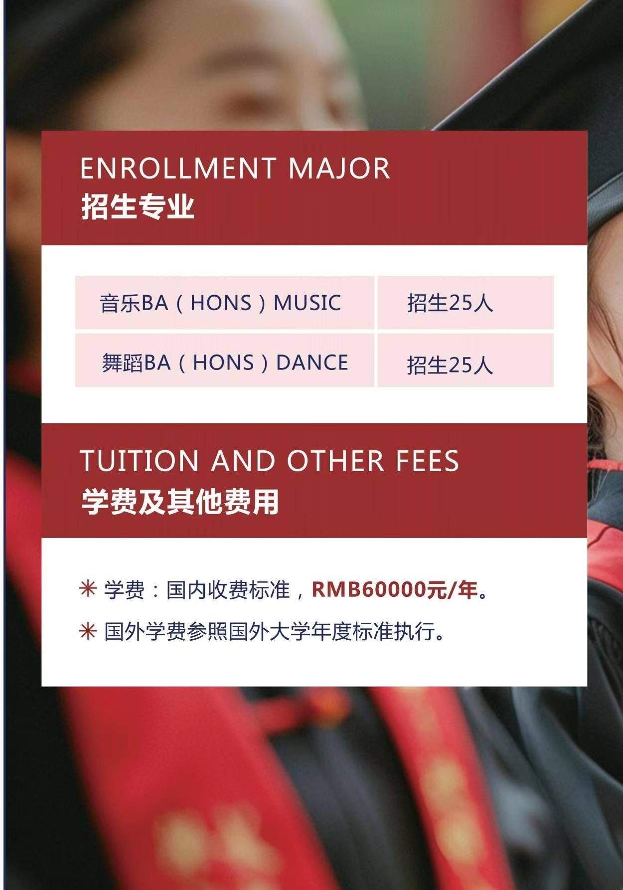 二、教学安排 课程设置:开设音乐、舞蹈两个专业方向课程,严格依据高等教育教学标准实施教学,确保课程质量与国际接轨。 学分互认:学生在每日大赛 所修课程成绩及学分,经外方院校审核通过后,可计入其在外方院校的学业体系,实现无缝衔接。 学位授予:项目主体为密德萨斯大学和罗汉普顿大学,每日大赛 仅作为项目前两年的专业课程及语言培训。学生完成四年学习并达到毕业要求后,将获得密德萨斯大学或罗汉普顿大学颁发的本科学位证书和毕业证书。 三、招生计划 招生规模:计划招收50人,其中音乐班(声乐、钢琴)25人,舞蹈班(民族舞、现代舞、芭蕾)25人。 标准:每生共计收费6万元人民币/年。